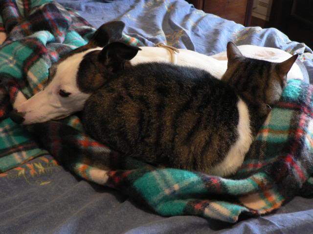 I gatti comandano e non si nasano più di tanto col cane (levriero whippet)...però questi due ogni tanto si strusciano il naso e dormono anche vicini...