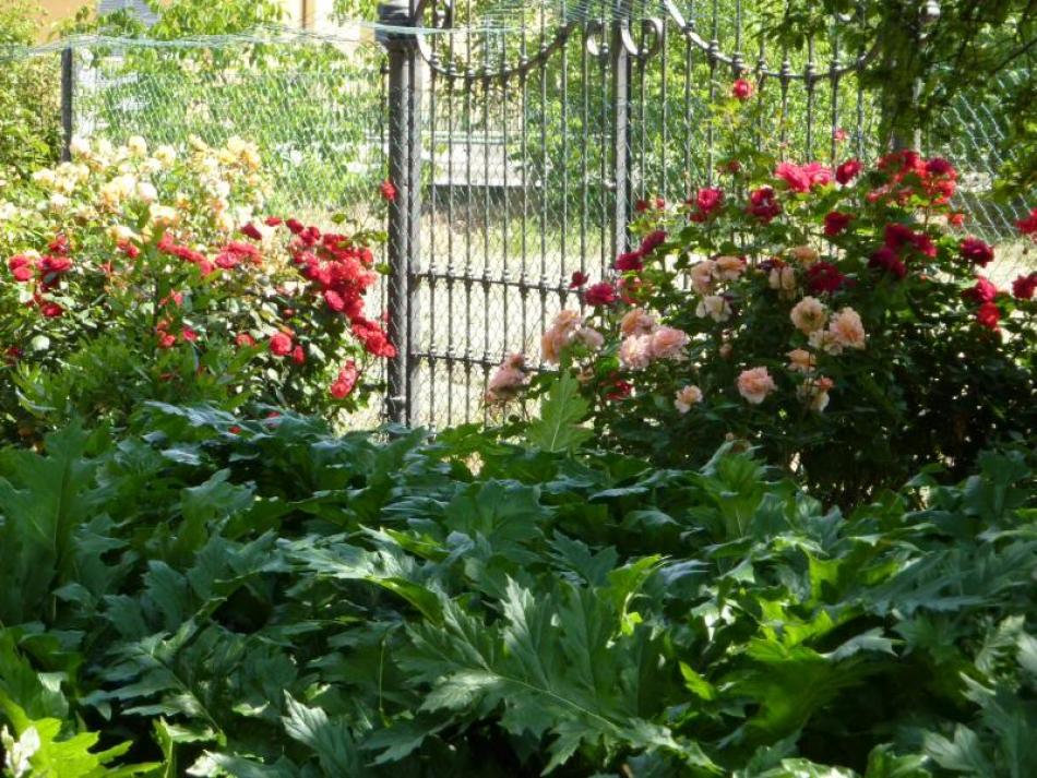 Ha foglie meravigliose, molto amate dalle lumache quando la pianta è giovane o sofferente, se invece si è scelto per lei un luogo ideale e si è ben sviluppata si presenteranno come nella foto qui in alto (nel mio giardino fanno da sfondo scuro e da "sipario" ad un gruppo di rose).