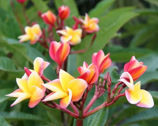 Oppure nelle terrazze e nei giardini delle città costiere, ecco la plumeria, in centinaia di cultivar (chiamata anche "Frangipani" o "Pomelia") un’apocynacea dei tropici, ora da molti apprezzata e coltivata, come pianta d'appartamento, anche in alcune zone del nord Italia. Allevata in Europa già fin dal '700 inizialmente dagli inglesi, si è poi diffusa soprattutto in Sicilia, dove si è acclimatata perfettamente. Da Palermo, nell'antico Orto botanico, dove tutt'oggi ne esistono degli esemplari vecchissimi, si è poi diffusa lungo la zona costiera palermitana; è presente ora in tutte le coste della Sicilia. Nella Palermo dei primi '900, saremmo stati affascinati dal loro profumo, dolce, aereo, che richiama alla mente, a detta di molti, essenze di cannella, vaniglia, rosa selvatica, gelsomini e agrumi...