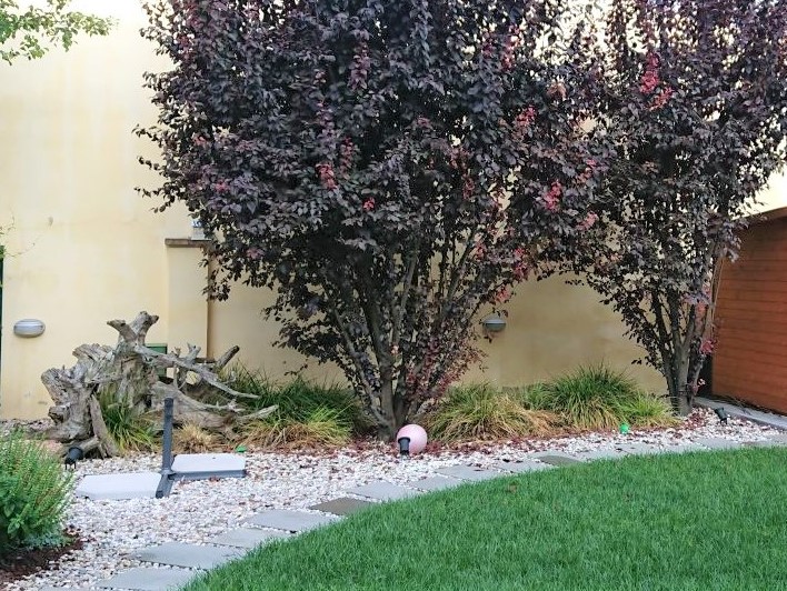 vorrei chiedere un consiglio per rinnovare ed abbellire la zona del giardino in foto, sotto i due pruni, perché la attuale situazione non è il massimo. Vorrei aggiungere o sostituire gli attuali arbusti, con altri sempreverdi, ma più decorativi, colorati, magari con fiori così da creare un po di colore nella zona e contrastare con il rosso scuro, quasi nero, delle foglie del pruno.