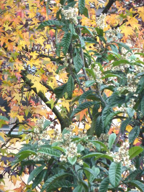 Oggi ne ho visto uno che faceva da sfondo ad un Nespolo (Nespolo giapponese - Eriobotrya japonica) sempreverde, lasciato crescere alto e libero... mentre le foglie del Liquidambar sono aromatiche se schiacciate, i fiori del Nespolo sono bianchi, pelosi, in pannocchie, e profumano intensamente