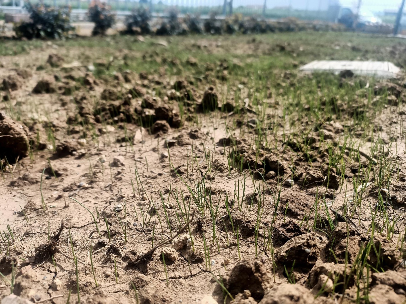 E' molto rado, ma soprattutto la cosa che salta all'occhio è la pessima preparazione del suolo. Terreno grigio, che forma una patina lucida in superficie (si formerà il muschio e diventerà talmente duro che l'erba non si allargherà) già si formano crepe, e inoltre non è stato sminuzzato bene... doveva essere più scuro perché andavano aggiunti e tritati nei primi 20 cm di suolo, dei sacchi di buon terriccio e stallatico pellettato.