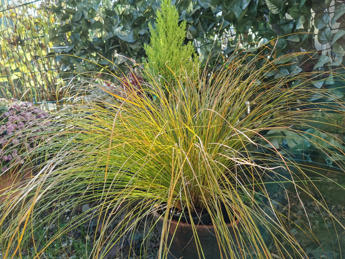 Salve, qualche settimana fa ho comprato in centro qualche vasetto di una deliziosa Graminacea color oro con le punte leggermente arricciate, le piantine sono piccole, erano in vasi da 9cm circa, la Graminacea alta circa 18 cm.