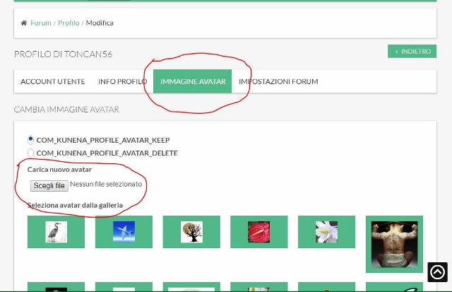 quindi clicca sul tasto "Immagine avatar" dove ti si presentano diverse possibilità: puoi caricare una tua immagine o scegliere tra quelle già inserite.