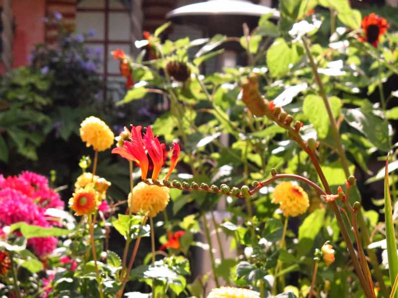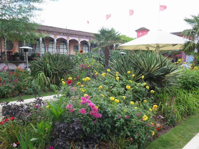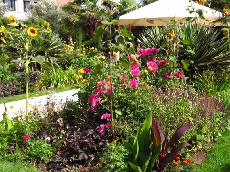 Per dire che si può fare giardinaggio con ciò che si ha o che vegeta bene in zona. Vedo delle dalie, dei tageti, qualche girasole, canne fiorifere, crocosmia, palme e yucche varie. Roba da mediterraneo.