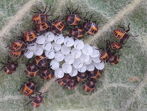 Sotto le foglie del nespolo che ho sul terrazzo (Milano) ho trovato queste uova da cui sono già usciti piccoli insetti.