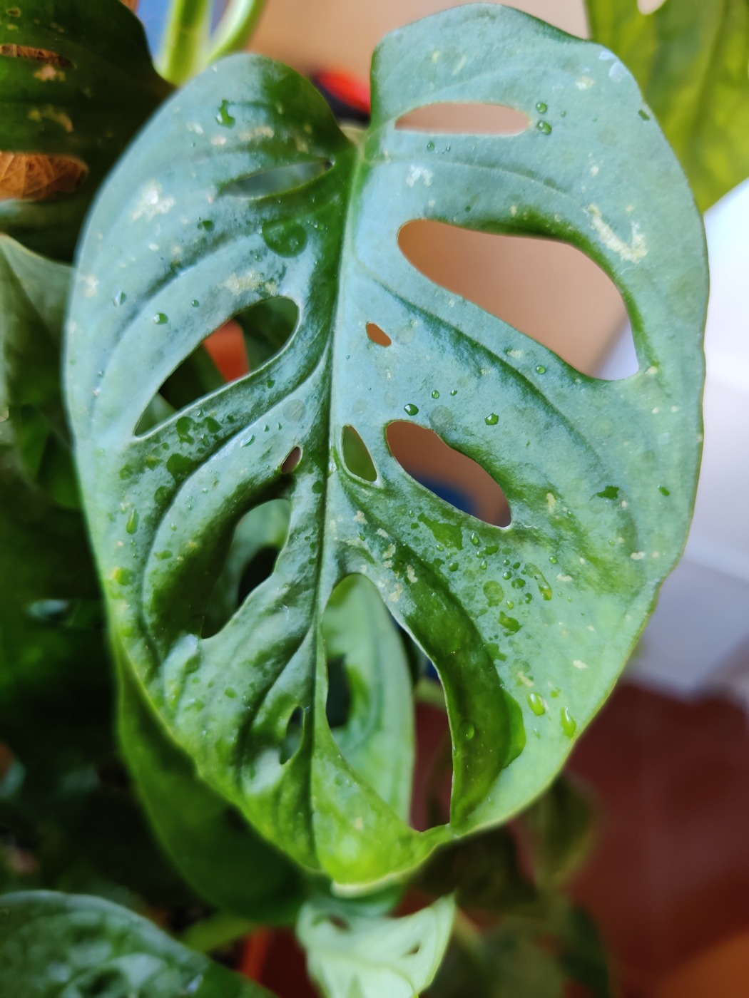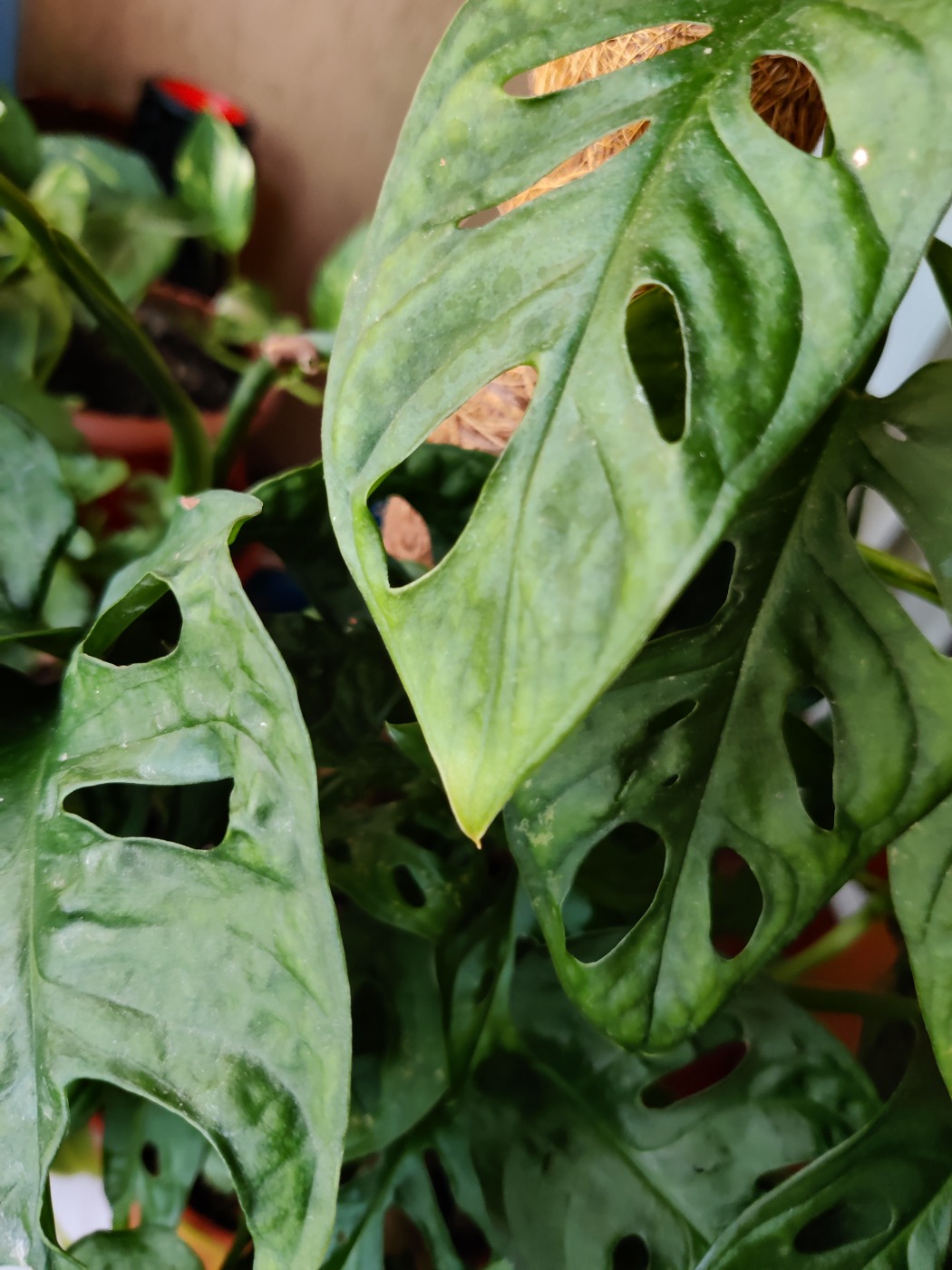 ho preso una Monstera Adansonii a luglio. Avrà fatto una decina di foglie nuove finora, solo che le fa diverse rispetto a quelle già presenti nella pianta. Le foglie nuove sono di un verde più chiaro, presentano però delle macchie che si formano dopo qualche settimana dall'apertura della foglia. Le foglie sono anche più strette delle foglie già presenti, hanno una forma più stretta lateralmente.
