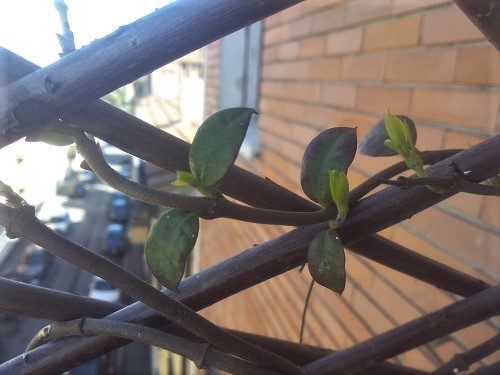 Le foglie vecchie semplicemente sono danneggiate dal gelo (questo gelsomino in caso di gelo intenso può defogliarsi completamente per poi rigermogliare). Mi chiedo se sia lo stesso anche per le gemme che forse sono leggermente danneggiate anche loro dall'ultimo gelo quando erano ancora abbozzate.