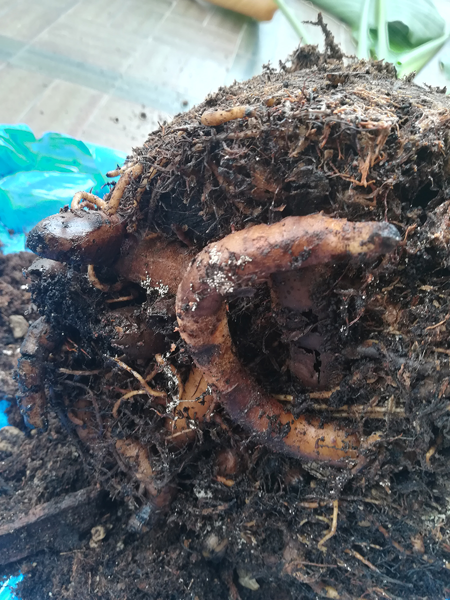 Nel tentativo di farla stare meglio (o peggio) l'ho spostata in un vaso più grande con della terra asciutta e ho notato che sulle radici erano presenti dei piccoli pallini bianchi (vedi foto). Cosa può essere? Posso fare qualcosa per salvarla?
