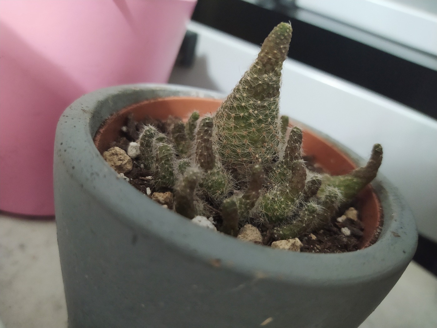 Ciao, questa pianta grassa è eziolata, ovvero allungata in modo anomalo al risveglio vegetativo, perché non ha ricevuto il sole sufficiente. L'hai sempre tenuta lì? Devi spostarla gradatamente (perché il sole può causare delle bruciature se la pianta vi viene esposta in modo repentino) sulla finestra più luminosa che hai, contro un vetro. Il colore non mi sembra strano, invece.