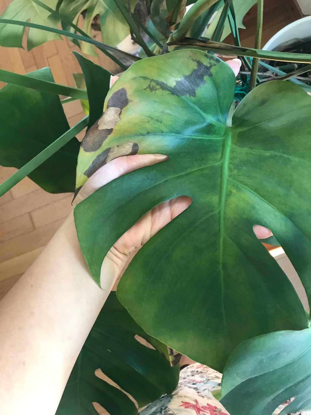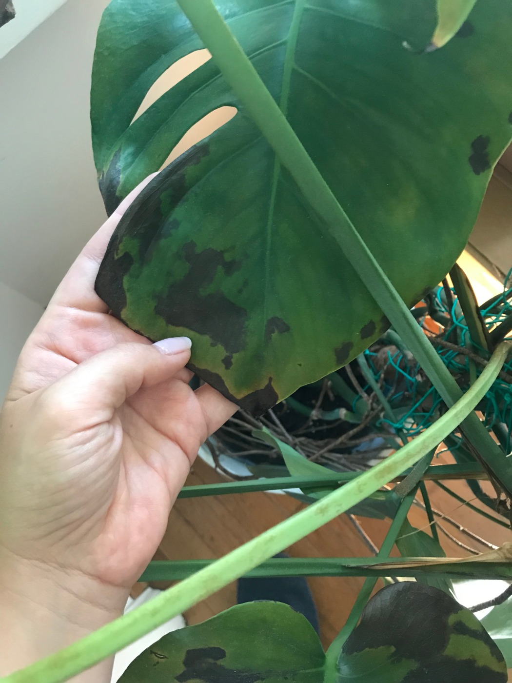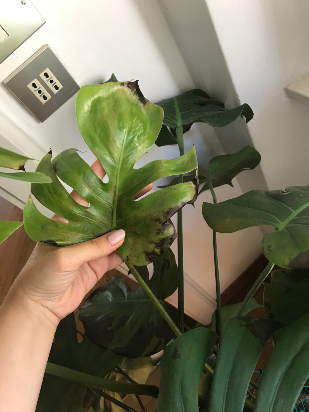 Buongiorno a tutti, ho un problema con la mia monstera e spero possiate aiutarmi. Ce l'ho da circa 3 anni e non mi ha mai dato particolari problemi. Le do acqua una volta alla settimana tutto l'anno e l'ho travasata soltanto una volta perchè è cresciuta tanto da quando l'ho comprata. Ho usato terriccio universale e sotto argilla espansa per drenare. Quattro mesi fa ho traslocato (non so se sia una coincidenza) e ho cercato di metterla in un posto con la luce simile a quella della vecchia casa. Ovviamente ho continuato con le stesse dosi d'acqua di sempre, ma ha iniziato a stare male! Prima si è macchiata di nero, poi sono apparse macchie di marrone più chiaro (allego foto). Sono nate tre nuove foglie, una è diventa subito nera, mentre le altre erano belle, ma dopo qualche settimana hanno iniziato a macchiarsi di marrone in maniera diffusa! Non capisco cosa abbia perchè sono tutte macchie diverse tra loro. I fusti alla base sono sodi e verdi e sembrano stare bene, mentre il fusto di una delle nuove foglie non mi sembra molto sano.