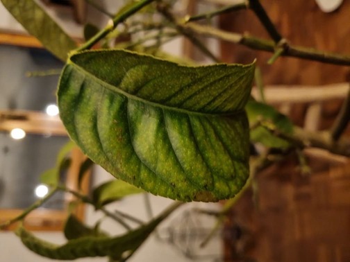 A parte queste cose da fare nell'immediato (le decolorazioni e le foglie che imbruniscono e si stingono/cadono, possono essere semplicemente causati dalla mancanza di luce, dal cambio dall'esterno all'interno), credo si tratti di ragnetto rosso. Puoi usare propoli per giardinaggio una volta a settimana fino alla scomparsa del parassita. Il ragnetto rosso causa decolorazioni e macchie "sfumate" così: