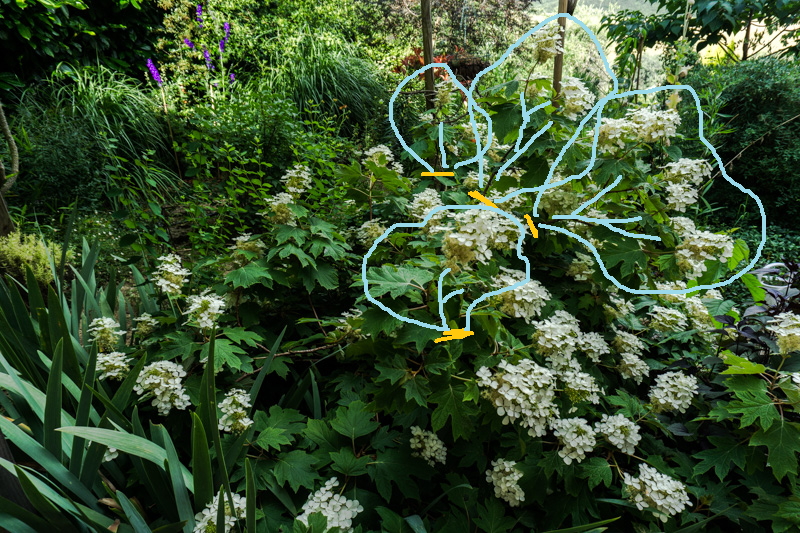 Ha detto bene Toncan, l'Hydrangea quercifolia fiorisce sui rami vecchi per cui se tagli troppa vegetazione rischi di compromettere la fioritura dell'anno prossimo per cui ti consiglio di togliere solo i rami che sono fuori dalla sua forma compatta; ora non sono lì dal vivo e non è facilissimo dare suggerimenti