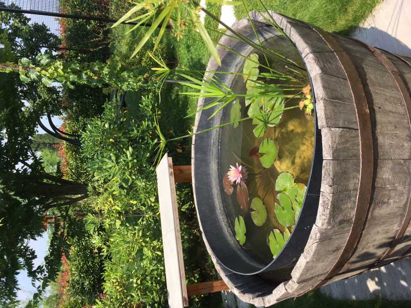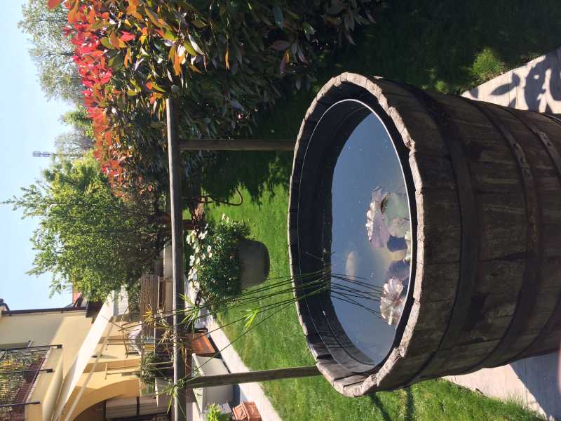 Entrambe le piante sono messe in vasi di plastica che sono poi stati posizionati nella tinozza. La temperatura dell'acqua nelle giornate più calde non supera mai i 30° ed all'interno ho inserito due pesciolini rossi ed alcune gambusie per tenere sotto controllo le zanzare. Devo dire che anche se si tratta di un piccolissimo specchio d'acqua...eppure tutte le sere sorseggiare un caffè o un liquore al chiaro di luna accanto al mio minipond mi rilassa molto.