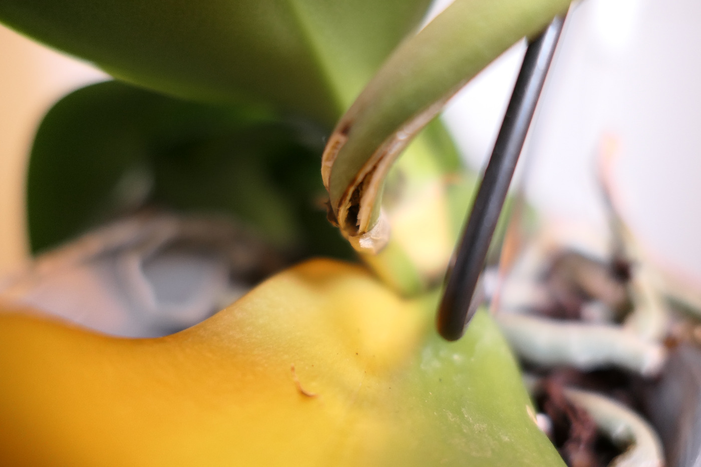 vi chiedo un consiglio riguardo alla mia orchidea. Una foglia è diventata completamente gialla e poi si è spezzata, ora ho notato che uno dei due steli principali è ingiallito e presenta un grosso taglio. A cosa potrebbe essere dovuto? Cosa dovrei fare? Grazie mille per il vostro aiuto.