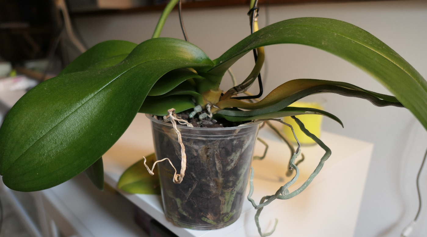 Ciao, spero che nel frattempo tu abbia spostato la tua orchidea più alla luce, perché è quasi certamente per una carenza di luce he le foglie ingialliscono; anche le altre verdi sono allungate e un po' flosce. Dovrebbe stare contro un vetro di una finestra dove non batte il sole.