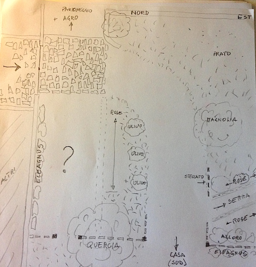 Metto una foto dello schema. Se io mettessi solo erbe basse si crerebbe una strada ottica-percettiva verso i campi, rimarrebbe cioè la vecchia strada mentre deve esserci una "difesa" dall' ingresso/cancello con solo una stradina impercettibile in mezzo. Poi che siano ginepri o altro.. Non rose, non peonie . Nota: sole dalle 10 in poi e gli ulivi non sono a terra ma in conche da limoni. TIA!