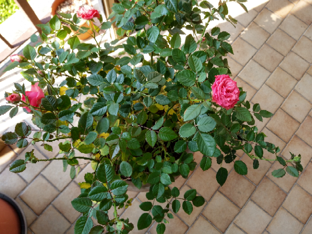 Credo che anche il vaso sia troppo piccolo, le rose, anche nane e miniatura, necessitano di un vaso grande, di almento 30 cm di diametro.
