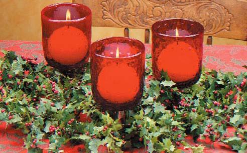 Il giorno stesso di Natale per apportare splendore alla tavola di casa, basta raccogliere qualche cima di agrifoglio (Ilex aquifolium) e spargerlo al centro del tavola (insieme a qualche candela rossa come nella foto seguente); un centrotavola di Natale fai da te più veloce e facile di questo vi sfido a trovarlo!