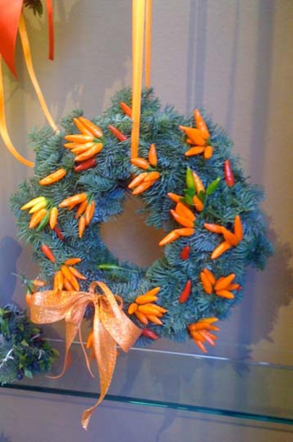 Un'originale e semplice ghirlanda natalizia fai da te da realizzare con abete argentato e peperoncini piccantissimi per rallegrare le nostre feste.