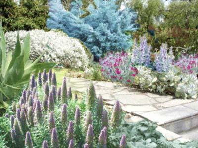 Giardino in grigio con Echium, Armeria, Lychnis coronaria e Stachys, Lavanda e Juniperus (Grey owl)
