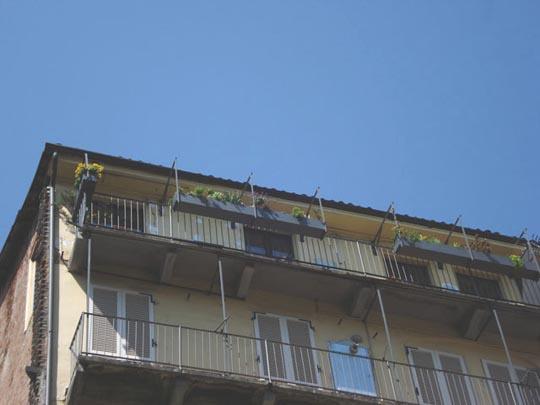 La possibilità alternativa suggeritami dall’esperienza del giardino pensile era quella di realizzare dei grossi vasi appesi in qualche modo al balcone e riempiti con il sistema inventato per il verde pensile, così avrei avuto con poco spessore (e peso) una superficie vasta a sufficienza per coltivarvi svariate specie. A seguito di lunghi colloqui con artigiani e professionisti (fabbri ed ingegneri, nella fattispecie) giunsi finalmente al progetto finale: dei contenitori in lamiera zincata appesi al muro con robuste staffe.