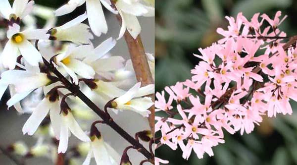 Un arbusto molto bello legato alla Forsythia dalla somiglianza dei fiori nella forma e nel tempo di fioritura è il meno conosciuto Abeliophyllum distichum (chiamato erroneamente «forsizia bianca»); genere con una sola specie, endemica della Corea, è in pericolo, in natura. Ha un profumo delizioso e fiori bianchi sempre con 4 lobi e sempre prodotti a primavera o a fine inverno a seconda del clima prima che le nuove foglie appaiano. Esiste anche la cultivar Abeliophyllum distichum 'Roseum' con fragranti fiori rosa su steli nudi.
